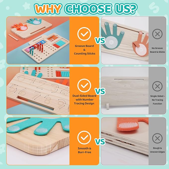 - Learning Toys with Number Blocks & Counting Sticks: The upgraded montessori math toy features a double-sided learning board, retaining the number tracing board and finger counting hands, with the added benefit of an innovative groove panel and 20 counting sticks. This panel allows kids to insert 20 counting sticks to visually represent math equations (e.g., 5+3=8) in the grooves, making abstract math concepts tangible and engaging. The design also allows for easy placement of accessories, keeping everything organized and preventing pieces from getting lost.
