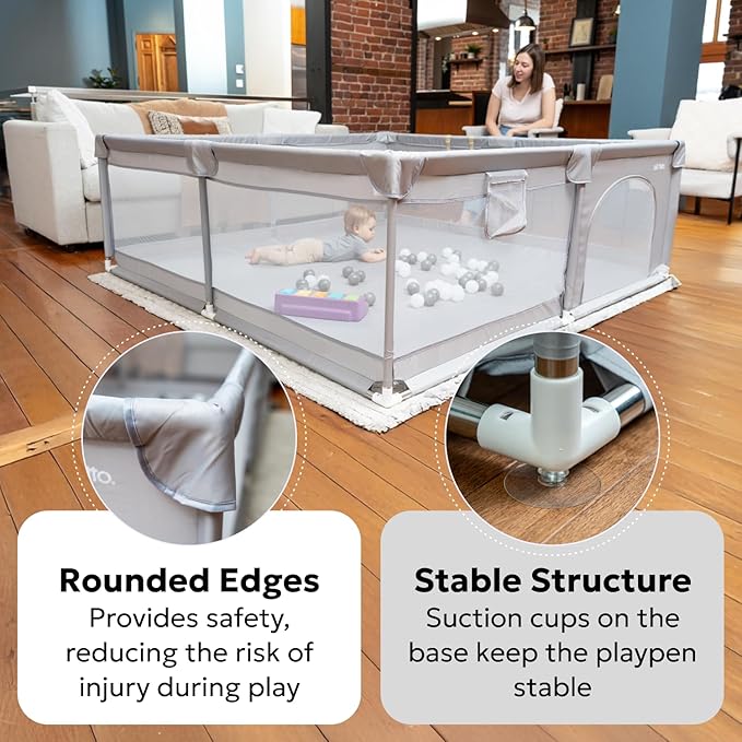 - Stylish & Modern Design for Any Space – This extra-large playpen blends seamlessly into any living room, playroom, or nursery. The neutral colors complement home decor while keeping toys contained and providing a secure play space for your child.