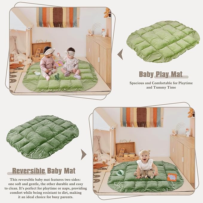 - SPACIOUS & THOUGHTFUL DESIGN: Our large and cozy tummy time mat offers an ample play area for your baby to explore, stretch, sit, or crawl. The mat is constructed from premium cotton, guaranteeing both durability and comfort. Additionally, it comes with 6 detachable sensory toys, including crinkle fabric, bells, and squeakers, providing endless engagement and developmental opportunities.