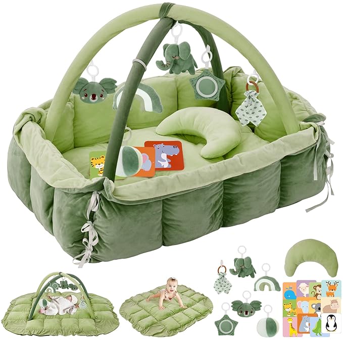- 7 INTELLIGENCE-BUILDING BABY TOYS&TUMMY TIME PILLOW: Enhance your baby’s development with our spacious tummy time mat, made from premium cotton for comfort and durability. It features 6 detachable sensory toys, including a koala, elephant, and rainbow, to engage your baby’s senses. The set also includes Double-Side Cards for learning and a Tummy Time Pillow for neck and head support. Perfect for babies at every stage, this all-in-one play center promotes developmental milestones in a fun, safe environment.