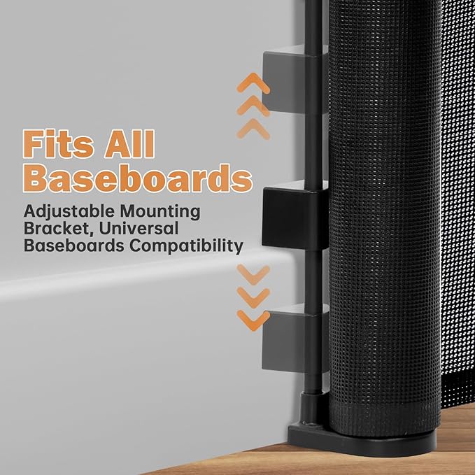 - 【Fiberglass Support】We have upgraded the retractable gate with fiberglass support strips, which prevent kids and pets from going under the mesh and reduce wrinkling. The mesh expands smoothly without getting stuck, making it effortless to use.