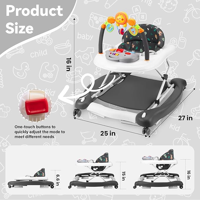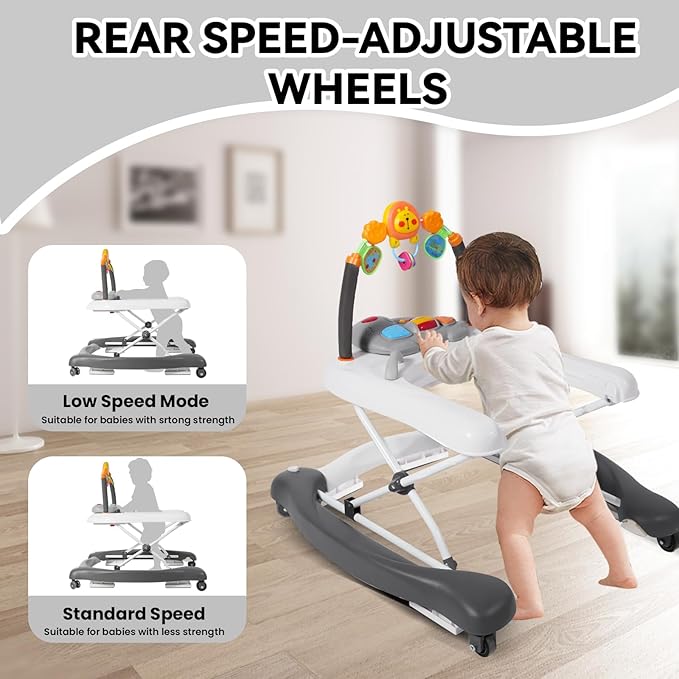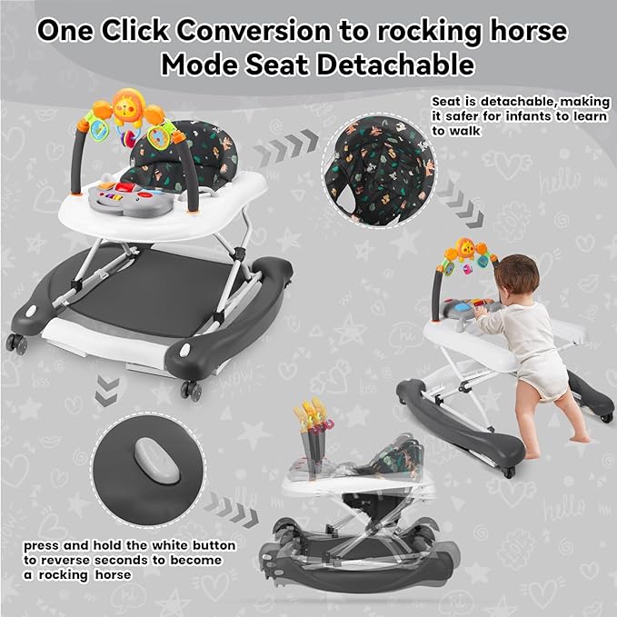 - 5-IN-1 Design: Baby walker can be easily converted into 5 modes: Walk mode, Bouncer mode, Rocking mode, Push mode, Eating mode. our baby walker with wheels will meet the needs of different stages of baby's exploration, growth, suitable for 6-18 months babies and free mom's hands