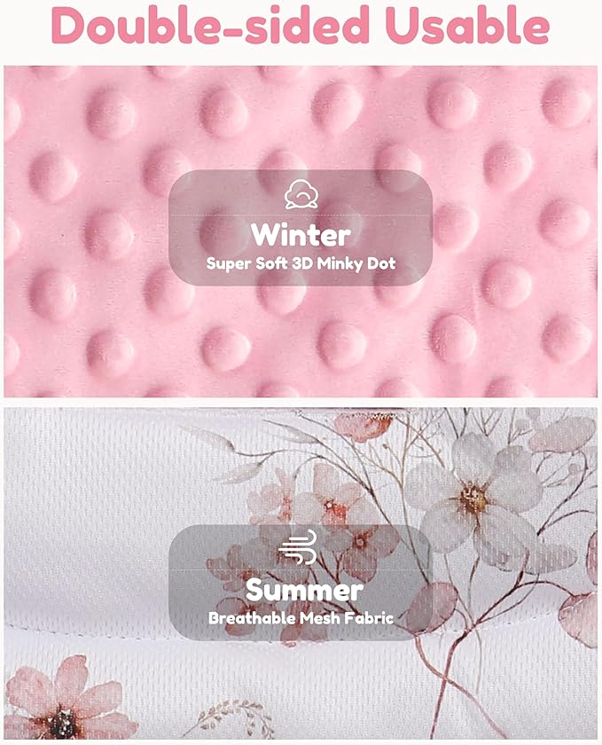 - Double-Sided, Comfort for ALL Seasons: Soft Minky Dotted Plush fabric on front side (cozy for winter) + breathable mesh fabric on back side (cool for summer). Adorable prints stimulate sensory development. Gentle on skin and perfect for road trips, park walks, or indoor rocker