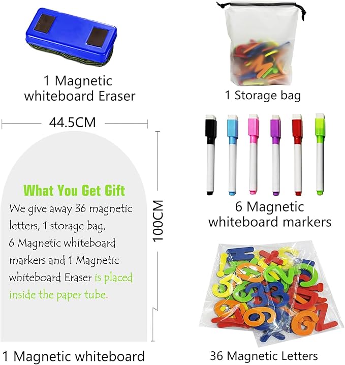 - VALUE - FOR - MONEY SET: It is a carefully prepared creative starting set! It contains 1 unique arc - shaped magnetic whiteboard sticker that showcases creative aesthetics. Paired with 1 magnetic dry - erase board with strong decontamination ability. There are 6 high - quality magnetic dry - erase pens, which write smoothly. With just a gentle wipe on the dry - erase board, the writing disappears instantly. Moreover, there are 36 magnetic letters and numbers. they are suitable for vocabulary teaching and spelling practice. Finally, there is 1 magnetic letter storage bag to keep everything in order. Start your creative journey right away.