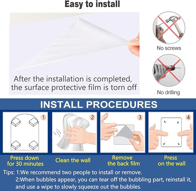 - PEEL AND STICK, UNLIMITED CREATIVITY: Tired of the limitations of traditional magnetic easels and the cumbersome construction of magnetic paint? Try our magnetic whiteboard sticker! Compared with traditional products, its convenience is off the charts. It uses a convenient adhesive backing, which can be peeled and stuck immediately, without being restricted by space. It can be installed in offices, classrooms, and homes. Due to the relatively large size of the product, to ensure a flat and flawless installation, it is recommended that two people work together. One person peels off the adhesive backing, and the other smooths it out, allowing creativity to easily integrate into your space.