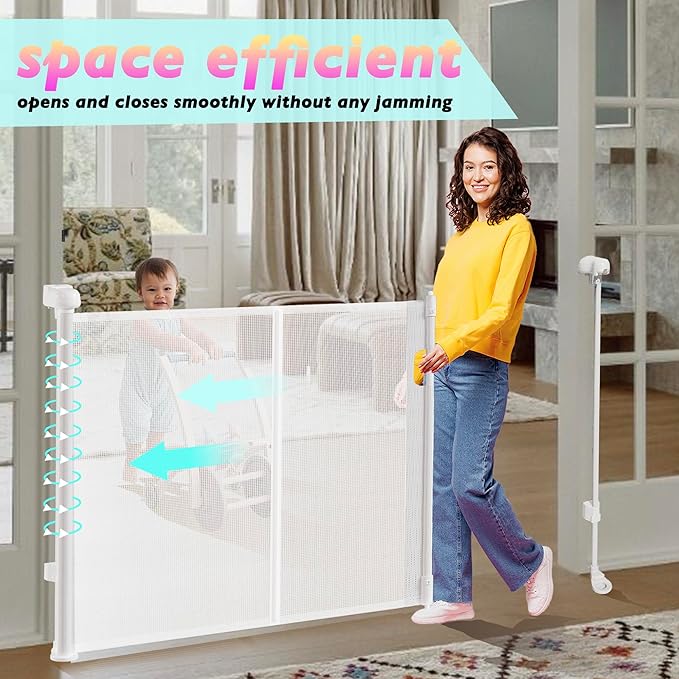 - Safety Double Lock Design - The retractable mesh gate features two locking mechanisms: a mesh lock that controls the mesh's extension and retraction, and a hidden gate lock for opening and closing the gate. Designed for adult convenience, it remains particularly challenging for children, effectively preventing them from opening the gate alone and accessing hazardous areas.