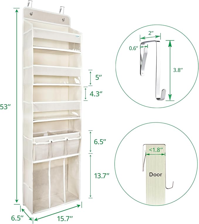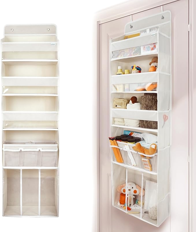 - CREATIVE PATENT DESIGN: This is not only a door hanging storage organizer, but also with an additional movable baby diaper storage caddy . The storage caddy has built-in partitions that can be divided into areas for storing daily necessities,such as bath care, clothing, diapers, baby moisturizers, wet wipes, breast pumps, and accessories. There are three PVC pockets on the outside of the nursery storage caddy for storing small items such as nail clippers, pacifiers, small toys, etc. The storage caddy can be easily removed from the hanging organizer and placed next to the bed for convenient use during late night feeding.