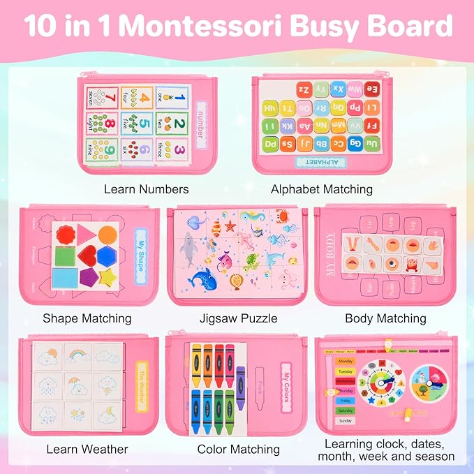 - 【Montessori Toys】Busy board for toddlers has 10 pages to play, featuring multiple varieties of toddler activities, and helps your kids to develop fine motor skills. This toddler busy board is designed in varying difficulty levels to be challenging but not too much to keep your toddlers interested.