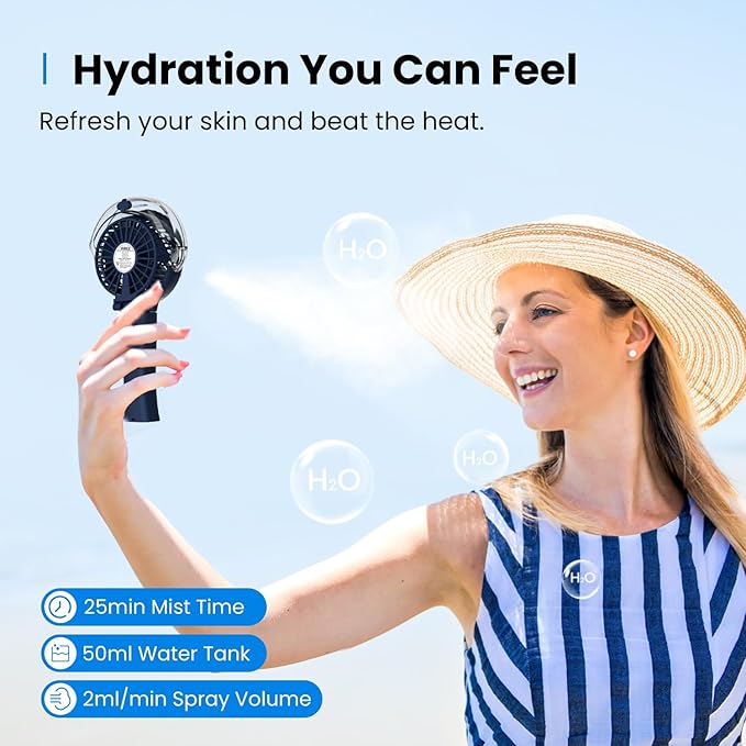 - Instant Refreshment: The 50ml tank delivers mist at 2ml/min for up to 25 minutes of cooling relief.
