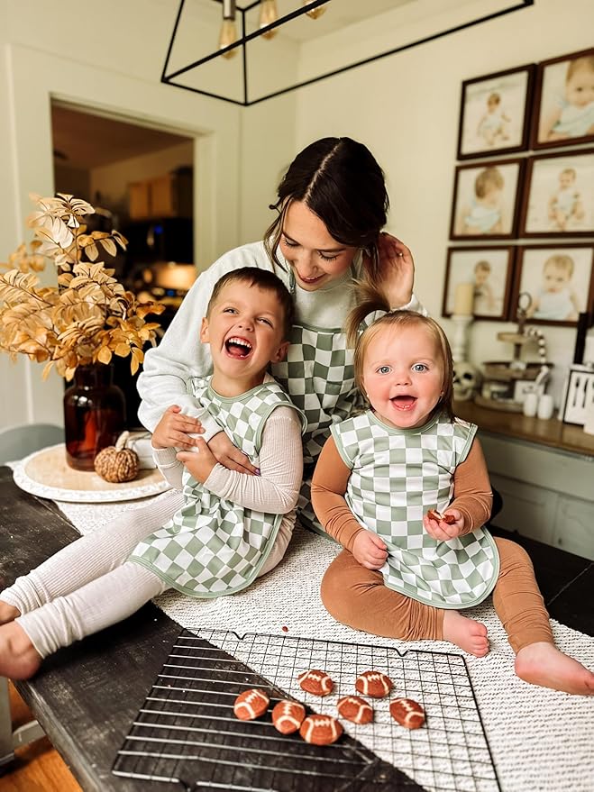BapronBaby Sage Checkerboard Bapron - No Neck Tie Safer Bib for Baby & Toddler - Soft Waterproof Stain Resistant - Machine Washable - Sz Preschool 3-5yrs