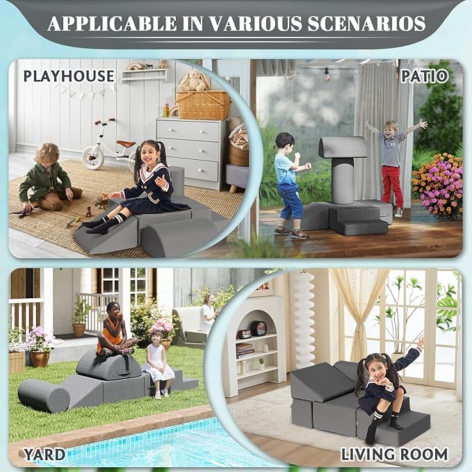 - Waterproof and Stain-resistant Fabric:The jela foam climbing blocks with upgraded Olefin waterproof fabric have dual protection against moisture and UV rays. This soft play set can be placed freely in children's rooms, on terraces, or in courtyards, allowing children to play without restrictions. In the face of situations like juice spills or mud stains, they can be easily wiped clean, continuously creating a hygienic play environment for children.