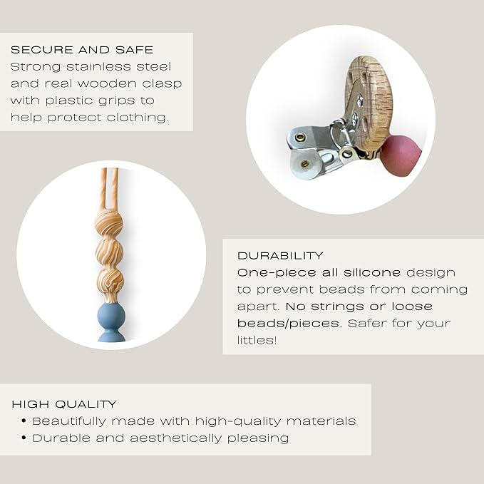 - ✔️ STRONG CLASP: The wooden clasp is made with a strong grip to keep your baby’s favorite teething toy or pacifier clean and safe from being dropped or getting lost. Plastic grips inside the stainless steel clip help to protect clothing. Just thread the loop through your item of choice and use the wooden clasp to attach it to their clothing, bib, carseat or stroller!