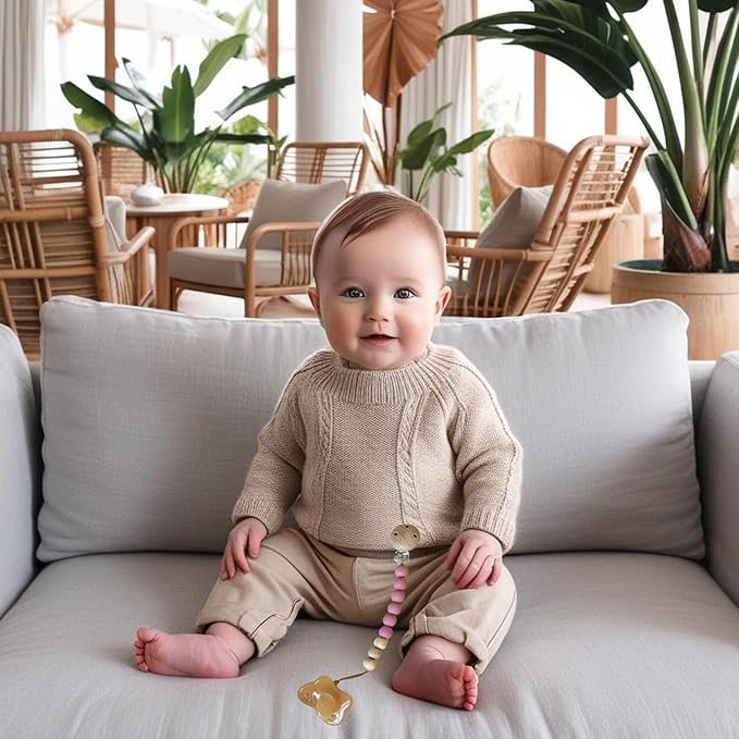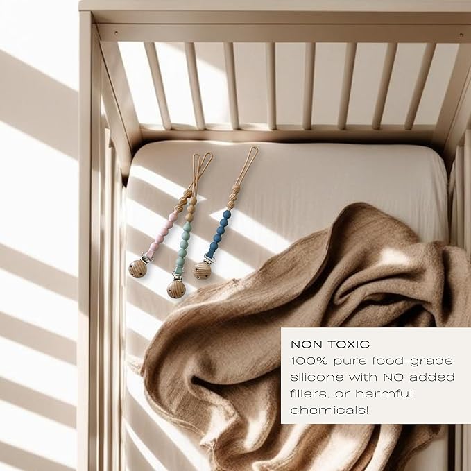 - ✔️ HIGH QUALITY: A set of beautifully made pacifier holders with high-quality materials that are durable and aesthetically pleasing. The silicone beads are soft & flexible. 4 colors to pair perfectly with different outfits and occasions!