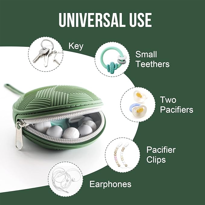 - Easy to Take With:The binky case holder with premium stainless steel zipper which can store pacifiers and small teether safely inside.The Loop is stretchy and the length is just right.It can be easily attached to the strollers, diaper bags, handbags, backpack,car seats and more,which is portable and free your hands,these silicone bags also can store some small belongings, such as keys, earphones, lip balm, earrings, coins and others.