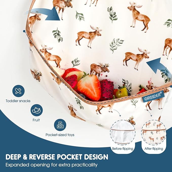 - ADORABLE AND FUNCTIONAL DESIGN: GRSSDER mess-proof bibs set include 3 different original adorable patterns, making your little ones more cuter and cheerful when feeding. Designed for comfort and convenience, our waterproof bibs keep your little one's clothes clean during mealtimes, playtimes and messy adventures. The deep catch-all pocket make it easy to grab every crumb, splash, and paint drip.