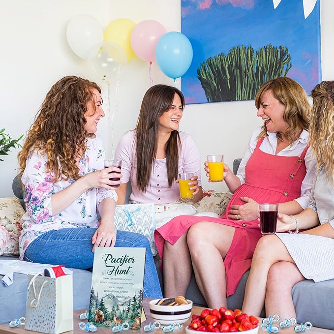 Thyle 51 Pcs Pacifier Hunt Baby Shower Games Include Hunt Sign and 50 Acrylic Pacifiers for Baby Shower Game Decoration Gift Sets Gender Reveal Party Decor(Let The Adventure Begin)