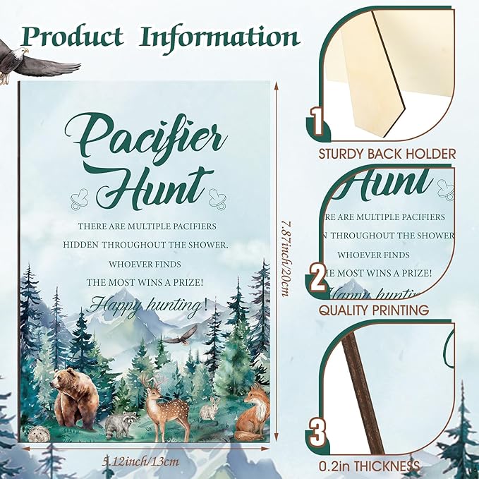 - Let the Adventure Begin Theme: the pacifier hunt wood board sign is printed with tree and animals, fitting the party theme; Additionally, the text displayed on the surface is interpreted so you can immediately grasp how to play this game