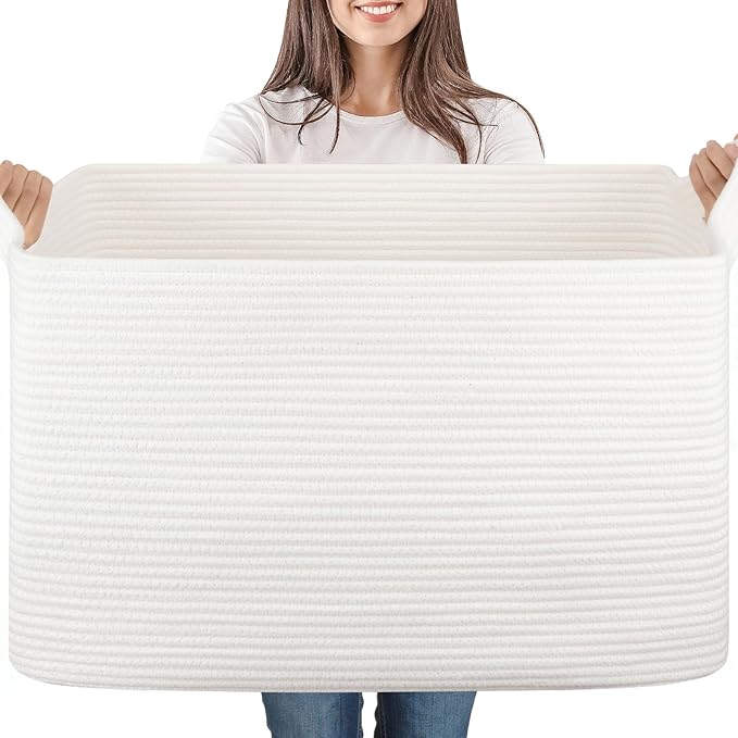 95L Large Storage Basket, Cotton Rope Woven Blanket Basket, Toy Storage for Baby Room, Living Room, 24" x 16.9" x 14.2", White