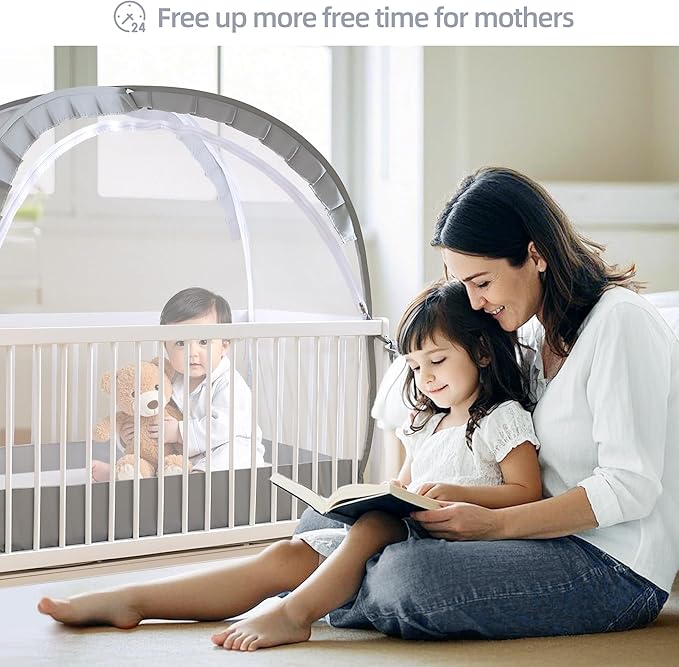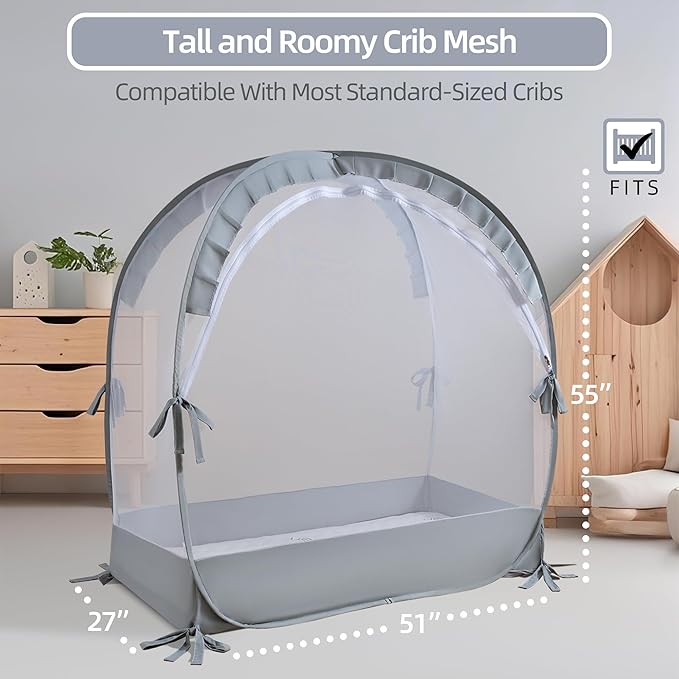 - ❤️【3-Second Pop-Up Design】 No tools needed! Simply remove the tape, and the crib tent self-assembles. Includes adjustable straps for all standard cribs (55.2"x27.6"x51.6").