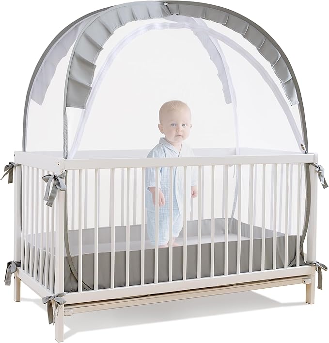- ❤️【360° All-Round Protection】The baby crib tent is equipped with two double-locking zippers and reinforced edges, which can prevent the baby from climbing out and falling, effectively avoid the limbs being stuck by the railings. Made with 1200-hole/inch breathable mesh for airflow while blocking insects and pets.