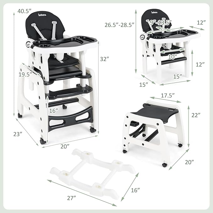 - 5-In -1 Convertible Baby Highchair: INFANS highchair for babies and toddlers has a multi-function design that it is not only a highchair, but also can be converted into a rocking chair or table and chair set. And the construction is also very simple to convert it into other forms. The table can be used as sturdy desk or dining table and the chair can be used as a dining chair, a rocking chair or toddler seat. Such high-usage frame makes it available for ages from 6 months to 8 years.
