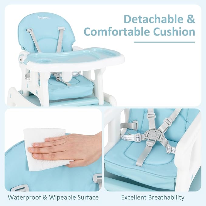 - 5-In -1 Convertible Baby Highchair: INFANS highchair for babies and toddlers has a multi-function design that it is not only a highchair, but also can be converted into a rocking chair or table and chair set. And the construction is also very simple to convert it into other forms. The table can be used as sturdy desk or dining table and the chair can be used as a dining chair, a rocking chair or toddler seat. Such high-usage frame makes it available for ages from 6 months to 8 years.
