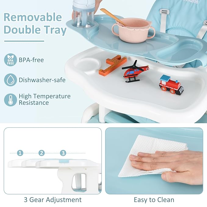 - Detachable Double Trays: Considering the variable use needs, our baby highchairs has a two layers tray. The trays are also detachable, the harmless PP materials also make them easy to clean and maintain. The top tray can be used for eating which have special grooves design and can be used as cup holder and cutlery holder. The bottom tray can be used for playing. And you can also remove the trays to use it as a toddler chair.