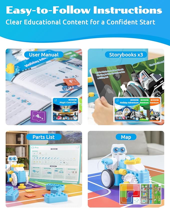 - 【Packed with Fun – Explore and Learn Independently】Comes with 4 storybooks, 1 activity map, 1 quick-start guide, 52 structural parts, 1 coding panel, 38 coding cards and 4 electronic components. With 12 guided models and plenty of room for open-ended building, C3Pro empowers kids to explore, experiment, and learn at their own pace—developing logic, creativity, and confidence through hands-on discovery.