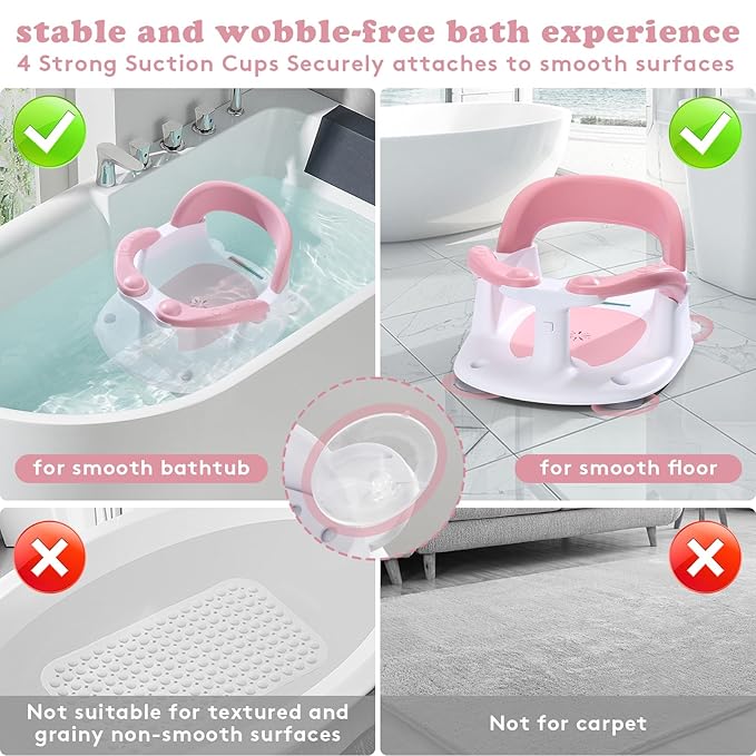 - Safe Comfort & with Thermometer Sticker: NFSVLB baby bath seats 6-12 months is crafted from premium PP+TPR materials, CPSC certified, and designed for bath seats for babies sitting up aged 6 months and up.Infant bath seat features a sturdy backrest to prevent tipping and 4 anti-slip suction cups that securely attach to smooth surfaces, ensuring your baby stays safe during bath time. The built-in thermometer sticker lets you know if the water is too hot, too cold, or just right, making baby bathtub seat a baby essential for a safer bathing experience.