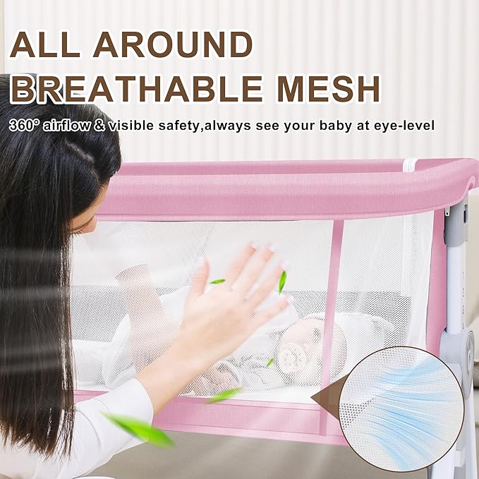 Baby Bassinet with Musical Toy,3 in 1 Baby Bassinets Bedside Sleeper,All Mesh Bedside Bassinet with Storage Basket and Wheels,7 Height Adjustable Bedside Crib for 0-6 Months Baby (Pink)