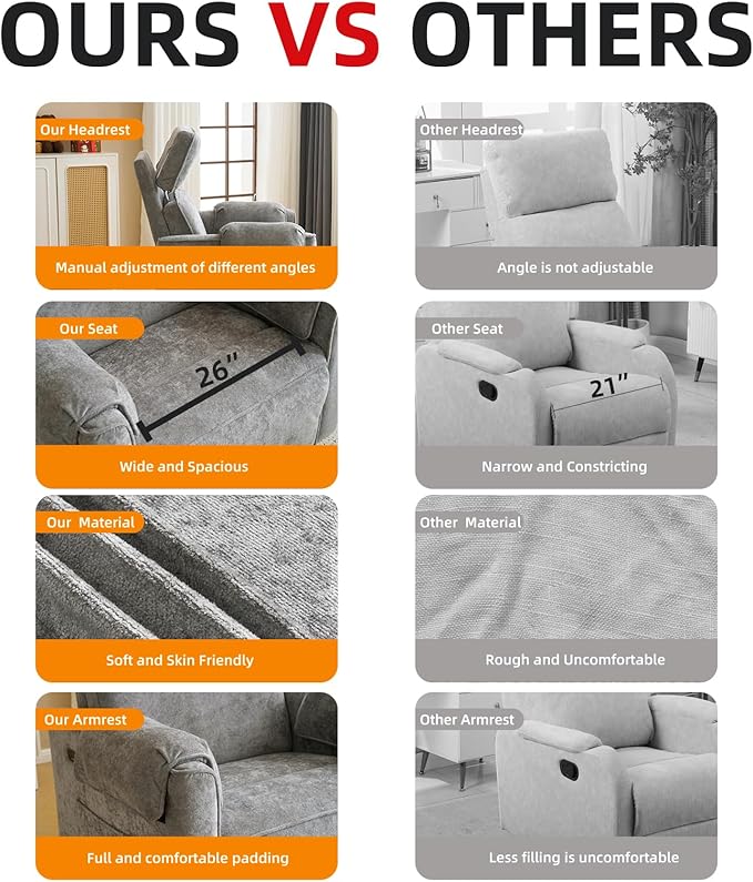 - 26" Extra Wide Seat: The 26" wider and larger seat is not only spacious and comfortable, but also suitable for a wide range of people, especially mothers and babies, as well as tall adults who can play and rest with their babies on the nursery recliner. The skin-friendly and comfortable chenille fabric and the stylish and beautiful design add a touch of sophistication to living rooms, bedrooms and nurseries.