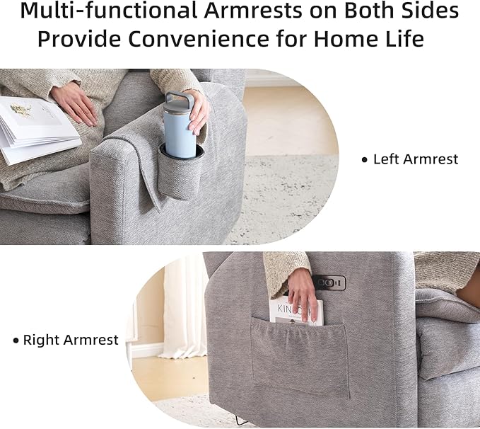 - Multifunctional Armrests: The left armrest of the glider recliner has a removable padded cushion and, as well as a cup holder, a mobile phone pocket and a tissue pocket. The right armrest has a USB and Type-C charging port and a side pocket that is not only convenient for charging but also ideal for storing books, magazines and baby essentials.