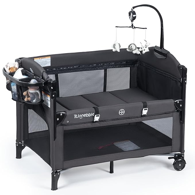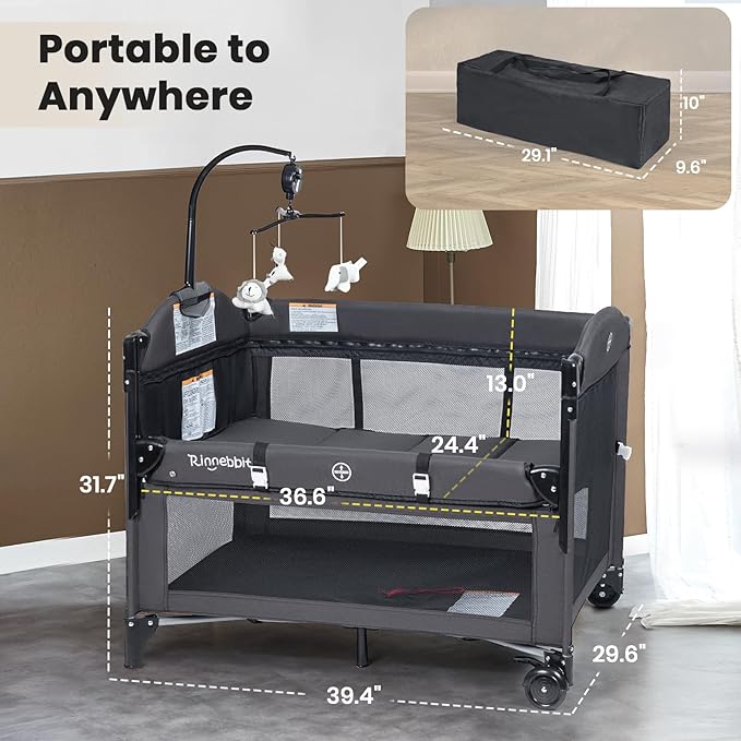- Convertible 4-in-1 Baby Bassinet - For newborns to 6-month-olds, the best place for that sleep is in a safety-certified bassinet, crib, or play yard in their parents’ room. Rinnebbit baby bassinet combines all the above demands in a nursery furniture. From practical bedside sleeper to changing table with storage basket, traditional baby crib, all-side view playpen, it offers your baby a secure surface and place at early stages. The top-mounted music box with three cute animals creates a harmonious sleeping atmosphere. Turn on the switch and rotate the spring, and it will swivel automatically.