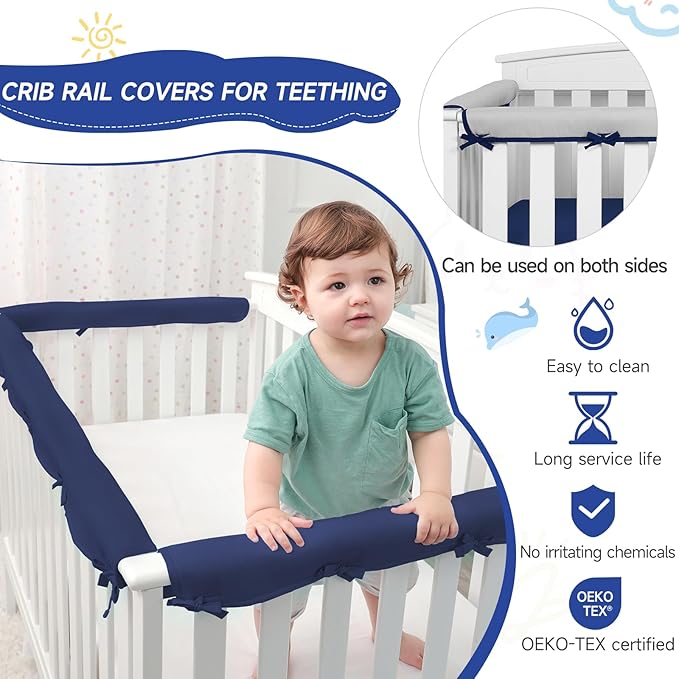 - 【Easy to use】: Easily installed in seconds, our crib railing cover is designed for quick and easy installation, saving valuable time for busy parents. Cover the top guardrail with the free side facing out, then pass a strap through the small hole, fasten the two straps tightly and tie a knot, and the crib rail protector is ready to use!