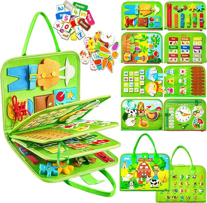 - [Learn While Playing]: Enhance your child's fine motor skills and finger dexterity through independent dressing activities. The Busy Board's interactive elements, such as the clock, calendar, and seasonal weather pages, promote cognitive skills, Explore the world of shapes, colors, farm animals, fruits, vegetables, and seasonal changes. Interactive features such as finger toys, spinning windmills, and feeding grass to cows can promote sensory development and cognitive skills.
