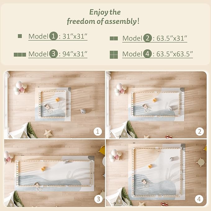 - Flexible Shape: Baby play yard can be assembled into 4 different sizes using 4-8 panels(Square, Rectangle, or L shape), maximum size 63x63 inches minimum size 31x31 inches. Enclosure turns any space into a play area and gives baby plenty of room to play, crawl, and explore freely to develop baby's sense of security and self-confidence.