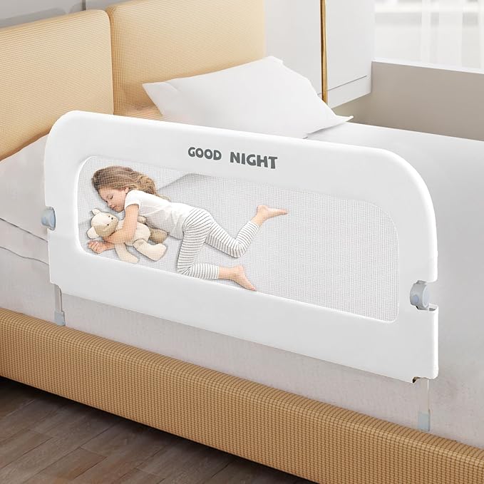 - 【Folding & Adjustable Height Design】With an upgraded folding design that allows for a one-touch downward bending swing, this kids bed guard rail allows you to easily fold it up to make getting in and out of bed easier! Meanwhile you can adjust its height to fit mattresses of different heights, creating a happy and safe harbour for your baby's sleep!