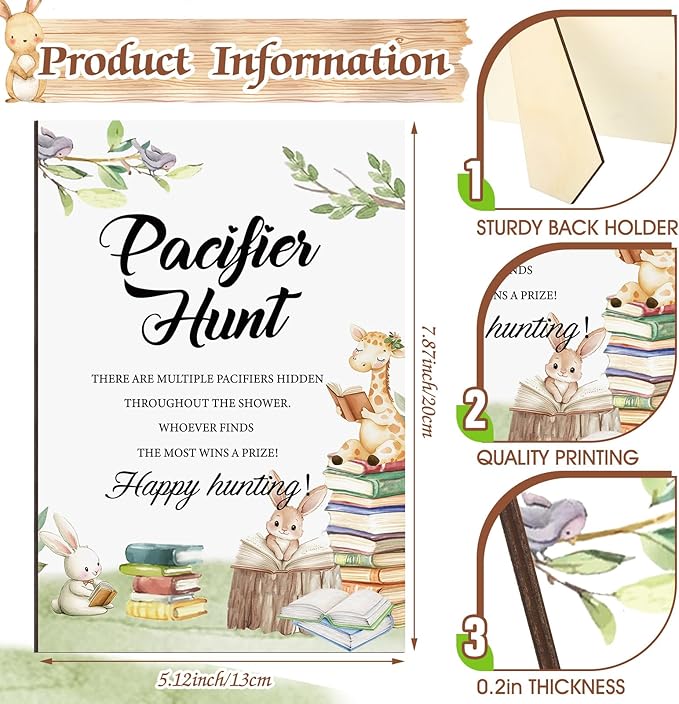 - Story Book Design: the pacifier hunt wood board sign is printed with lovely animals and books, fitting the party theme; Additionally, the text displayed on the surface is interpreted so you can immediately grasp how to play this game