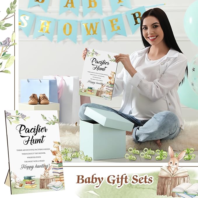 - Nice and Elaborate Combination: story book baby shower games are 50 baby shower pacifiers, 1 wooden cool baby shower game hunt sign in the package, enough for you to plan your baby shower party and to share with your friends and family