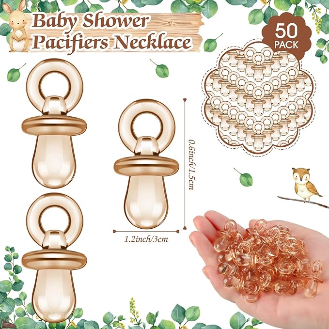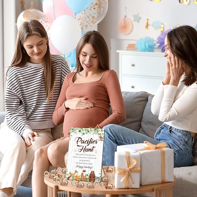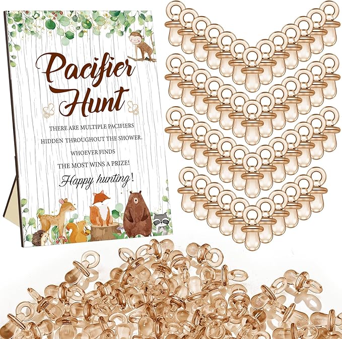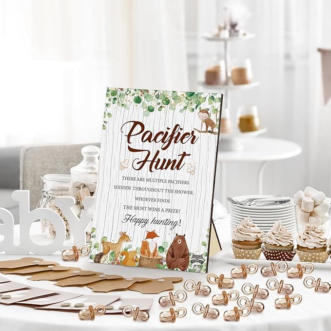 Thyle 51 Pcs Pacifier Hunt Baby Shower Games Include Hunt Sign and 50 Acrylic Pacifiers for Baby Shower Game Decoration Gift Sets Gender Reveal Party Decor (Woodland Animals)