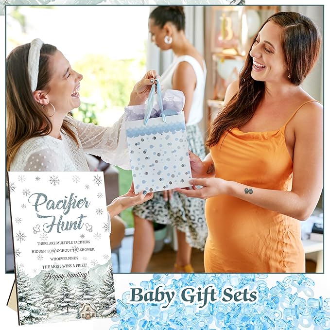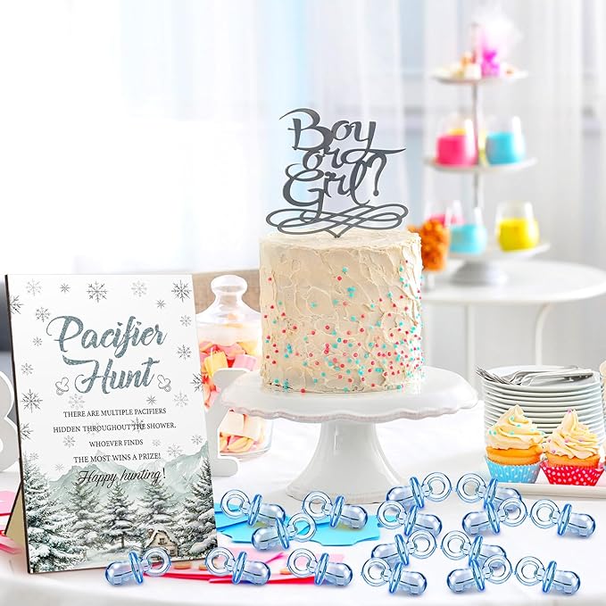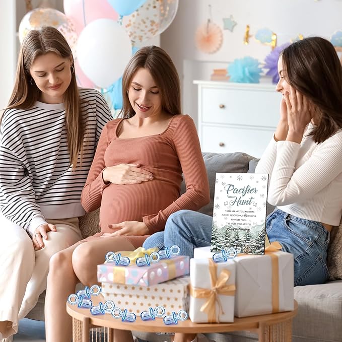 Thyle 51 Pcs Pacifier Hunt Baby Shower Games Include Hunt Sign and 50 Acrylic Pacifiers for Baby Shower Game Decoration Gift Sets Gender Reveal Party Decor(Baby It's Cold Outside)