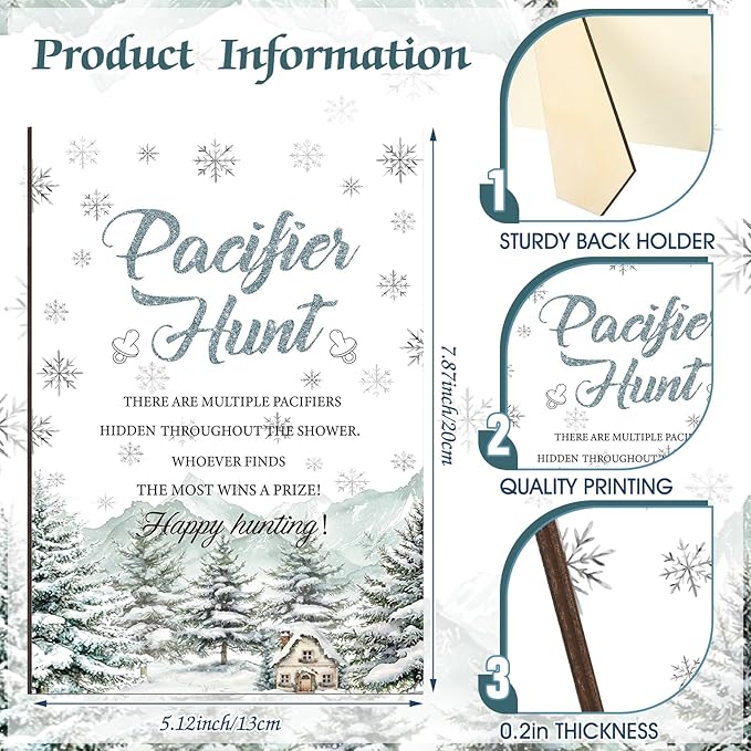 - Baby It's Cold Outside Design: the pacifier hunt wood board sign is printed with snowflakes and winter trees, fitting the party theme; Additionally, the text displayed on the surface is interpreted so you can immediately grasp how to play this game