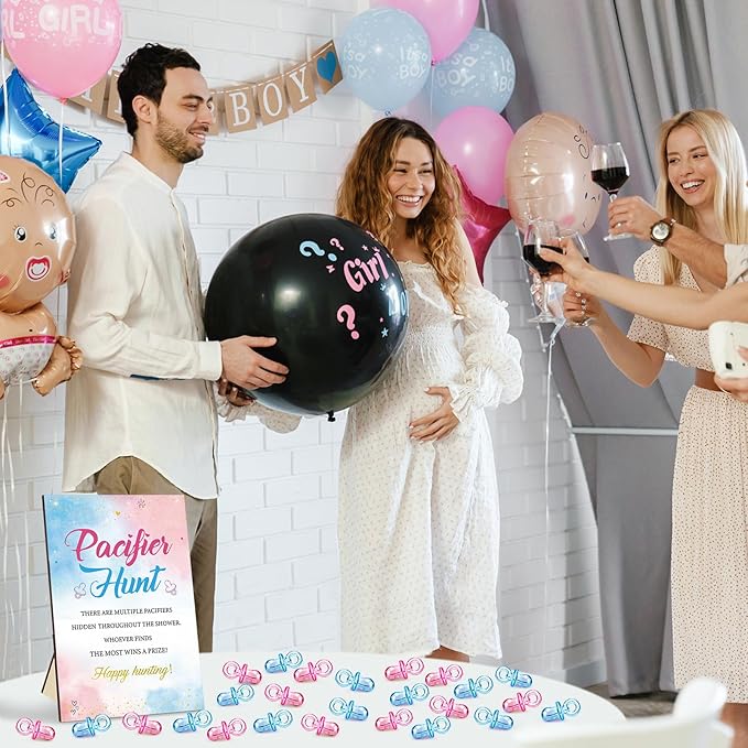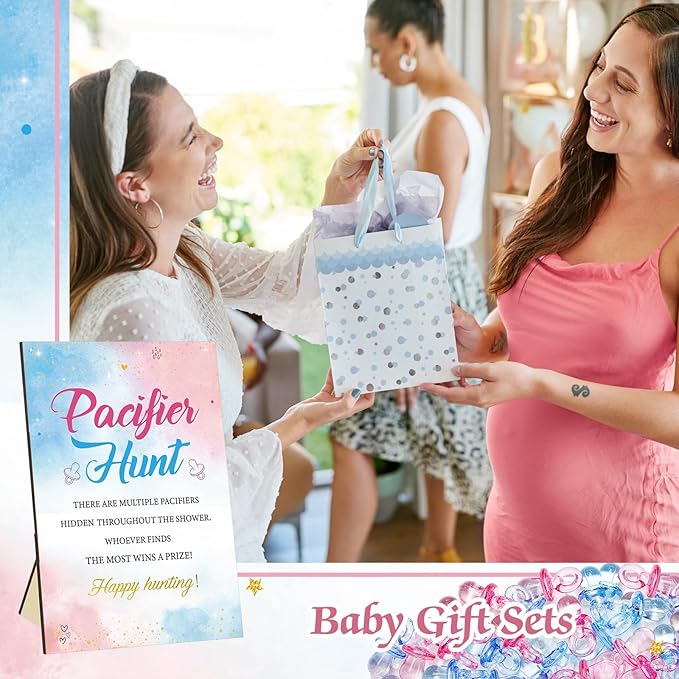 Thyle 51 Pcs Pacifier Hunt Baby Shower Games Include Hunt Sign and 50 Acrylic Pacifiers for Baby Shower Game Decoration Gift Sets Gender Reveal Party Decor(Gender Reveal)