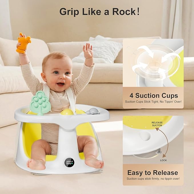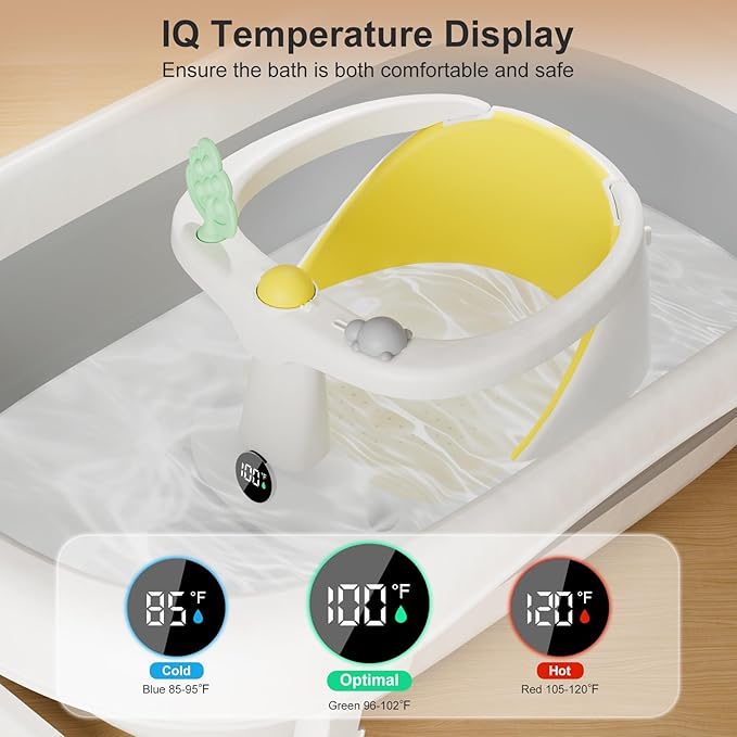- Smart Care for Delicate Skin: Babies have super sensitive skin. Our baby bath seat helps you monitor water temperature with an upgraded display. Simply dip the chair’s bottom in the water, check the reading, and maintain it between 98°F and 100°F. Easy peasy, ensuring your baby stays comfy and safe during bath time