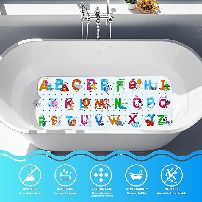 - FUN ANIMAL LETTERS DESIGN & GENEROUS SIZE: Make bath time a splash with our cute cartoon design that combines 26 letters and animals and English words! This 40x16 inch baby bath mat provides excellent coverage in tubs and showers, keeping your little one safe while sparking their imagination.