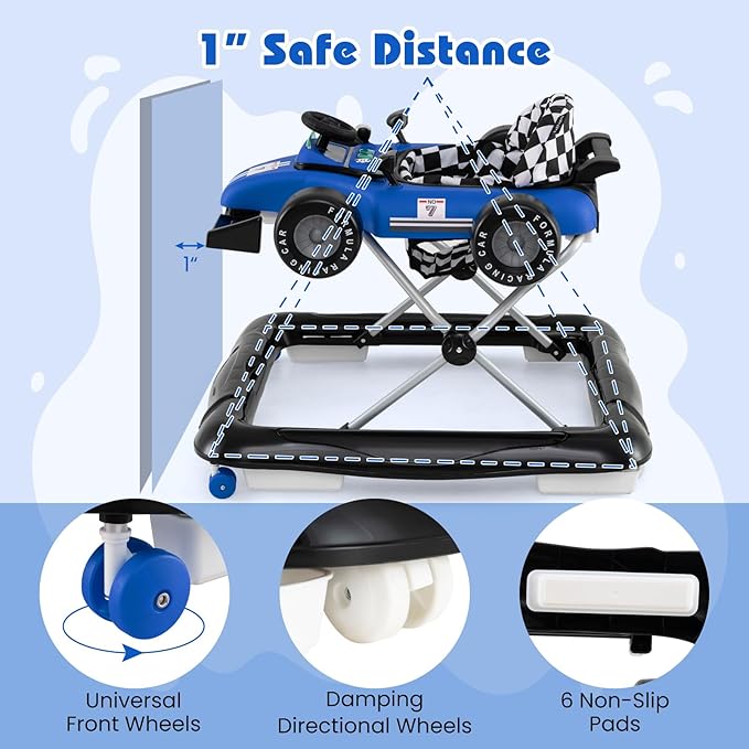 - 【Fun & Interactive Activity Center】 BABY JOY 4-in-1 Racing Car Walker takes your baby from stumbling steps to the fast lane of growth and witness them become winners on their own life path. The steering wheel, shifter, rear-view mirrors and light buttons satisfy your baby's curiosity for exploration. And the music keeps the fun going.