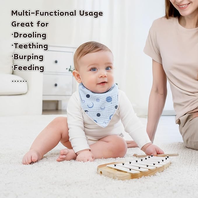 - Versatile Usage: Our bandana bibs are not only perfect for drooling but also for feeding, burping, handling spills, and messes. They can even double as a handkerchief on the go. Lightweight and plush, they boast an ultra-soft texture and are suitable for all skin types, including sensitive ones.