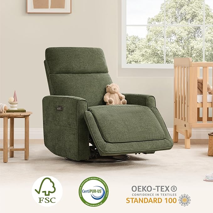 CHITA Electronic Power Recliner Chair Swivel Glider, FSC Certified Modern Nursery Rocking Chair with USB and Type-C Ports, Forest Green