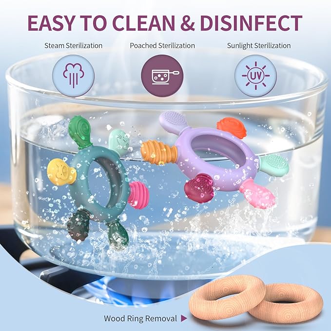 - EASY TO CLEAN: Our teething toys are easy to clean, simply wash with mild soapy water or boil to sterilize. Teething toys can also be stored in the fridge for extra cooling.(Note: the wooden ring can't be boiled, please remove it)