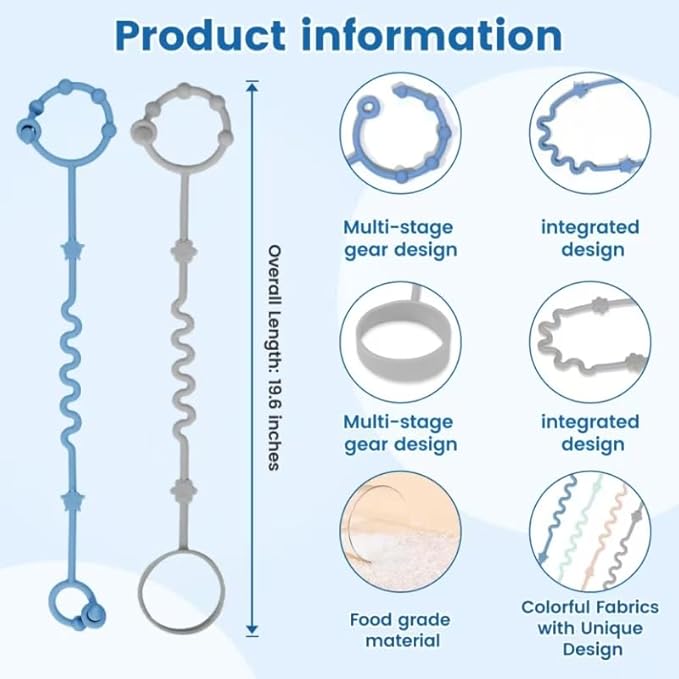 - Scope of Use: Baby toy straps can be used for strollers, baby high chairs, pacifier clips, teethers, car seat toys, baby sucking toys, and baby cribs. They can be taken out to play at any time, whether the baby is eating, crying, bathing, or traveling. Say goodbye to dropping and searching for misplaced baby essentials.